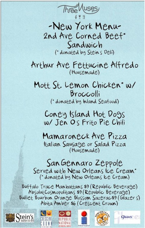 Most of the ingredients for the menu have been donated. For example, Stein’s Deli donated the corned beef, New Orleans ice cream donated their products. That allows Three Muses to give the entire proceeds to City Harvest. “There’s a lot of generosity going on,” Esses said.