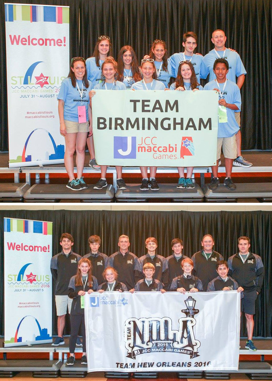 Above: Maccabi Games delegations from New Orleans and Birmingham have been competing this week in St. Louis. Birmingham will be one of the host cities for the 2017 Games. Birmingham has already medaled, with Adison Berger taking silver and gold in the 200-medley and 400-freestyle swimming relays, and Talia Fleisig and Hannah Halpern winning gold in dance.