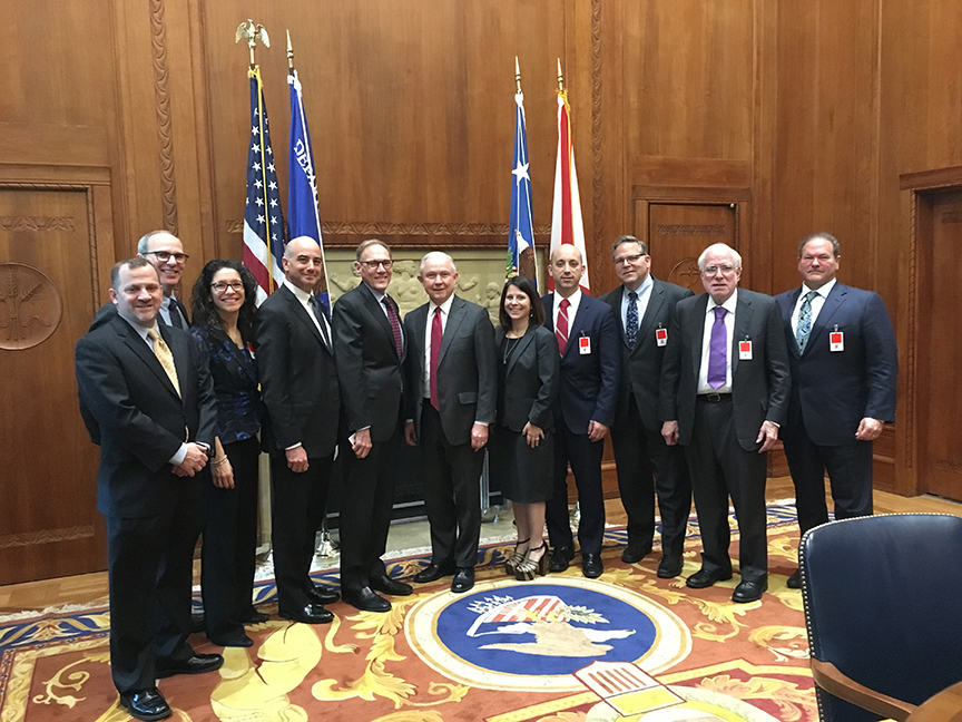 Barak Hermann, CEO, JCC of Greater Baltimore; Michael Feinstein, CEO, Bender JCC of Greater Washington, in Rockville, Md.; Ivy Harlev, Executive Director, Siegel JCC in Wilmington, Del.; Doron Krakow, President and CEO, JCC Association of North America; Stephen P. Seiden, Chair of the Board of Directors, JCC Association of North America; U.S. Attorney General Jeff Sessions; Betzy Lynch, Executive Director, Levite JCC in Birmingham; Jonathan Greenblatt, CEO and National Director, Anti-Defamation League; Jerry Silverman, President and CEO, the Jewish Federations of North America; Richard Stone, a previous Chairman of the Conference of Presidents of Major American Jewish Organizations; Paul Goldenberg, National Director, Secure Community Network.