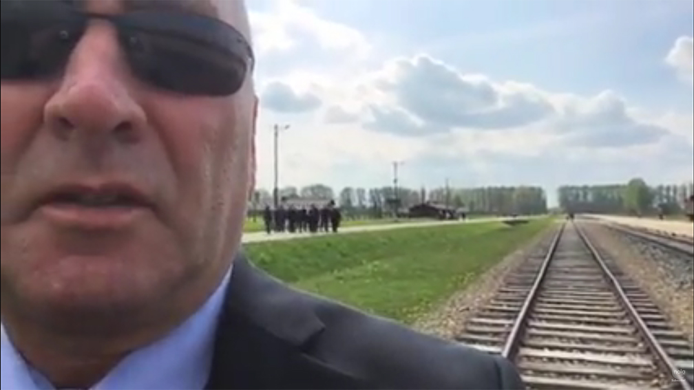 He spent about a minute of the video inside the gas chamber and crematoria, speaking in a low voice with nobody else around, and describing what took place in that space. He then spoke outside the suffocation room where laborers were punished. “We must remember these things,” he said. “Man’s inhumanity to man can be quite shocking.”