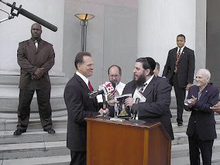 This is not the first time a New York rabbi has come to Alabama to stand with Moore. In 2003, Rabbi Yehuda Levin spoke at a rally when Moore was Chief Justice of the Alabama Supreme Court and was defying a court order to remove his 5,280-pound granite monument of the Ten Commandments from the state Supreme Court building.