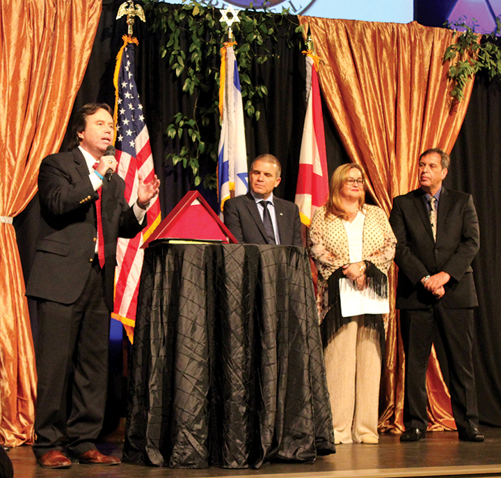 In his invocation, Pastor Rusty Nelson of Rock Family Worship Center — which holds a big Israel celebration each year — said “it is so humbling that we get to live in these days, to embrace the Jewish people.”