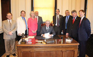 Governor Phil Bryant signes bill permitting the State of Mississippi to invest in Israel bonds. At the ceremony: Rabbi Jeff Kurtz-Lendner of Beth Israel in Jackson; State Rep. Hank Zuber; Treasurer Lynn Fitch; State Rep. Donnie Hill; Governor Phil Bryant; Executive Director, Israel Bonds Southeast Region Executive Director Brad Young; Israel Consul General from Miami, Lior Haiat; State Rep. Greg Snowden; National Managing Director, Israel Bonds Corporate and Institutional Sales Larry Berman.